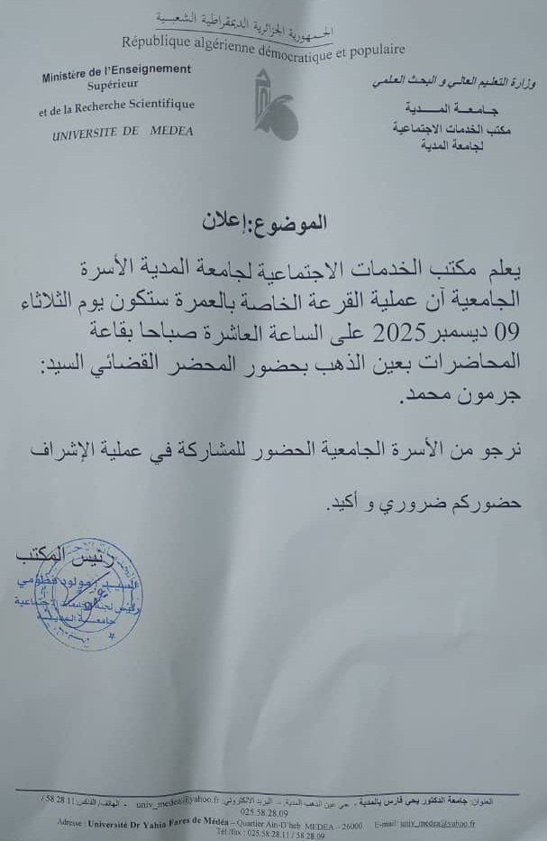 نعلم الطلبة أنه تم  تمديد فترة الطعون الخاصة بنقطة الامتحانات  عبر تطبيق WEBETU (progres)   إلى غاية 03 فيفري 2026. آخر المستجدات