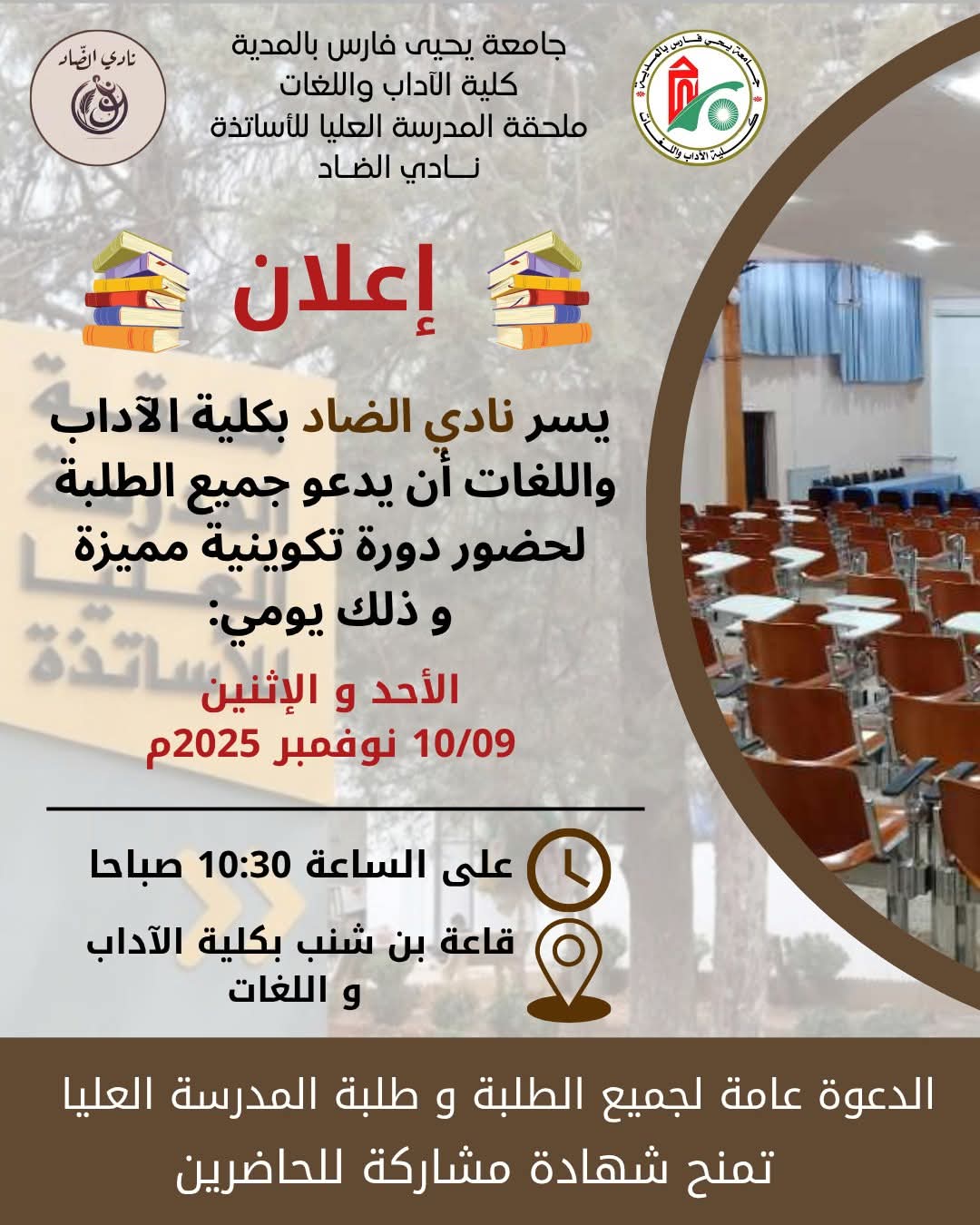 يسر إدارة -المدرسة العليا للأساتذة بالقبة – ملحقة المدیة ان تدعو طلبتها الأعزاء الى حظور دورة تكوينية يومي الأحد والإثنين 9 و 10 نوفمبر 2025 على الساعة 10 صباحا بقاعة المحاضرات بن شنب بكلية الآداب واللغات