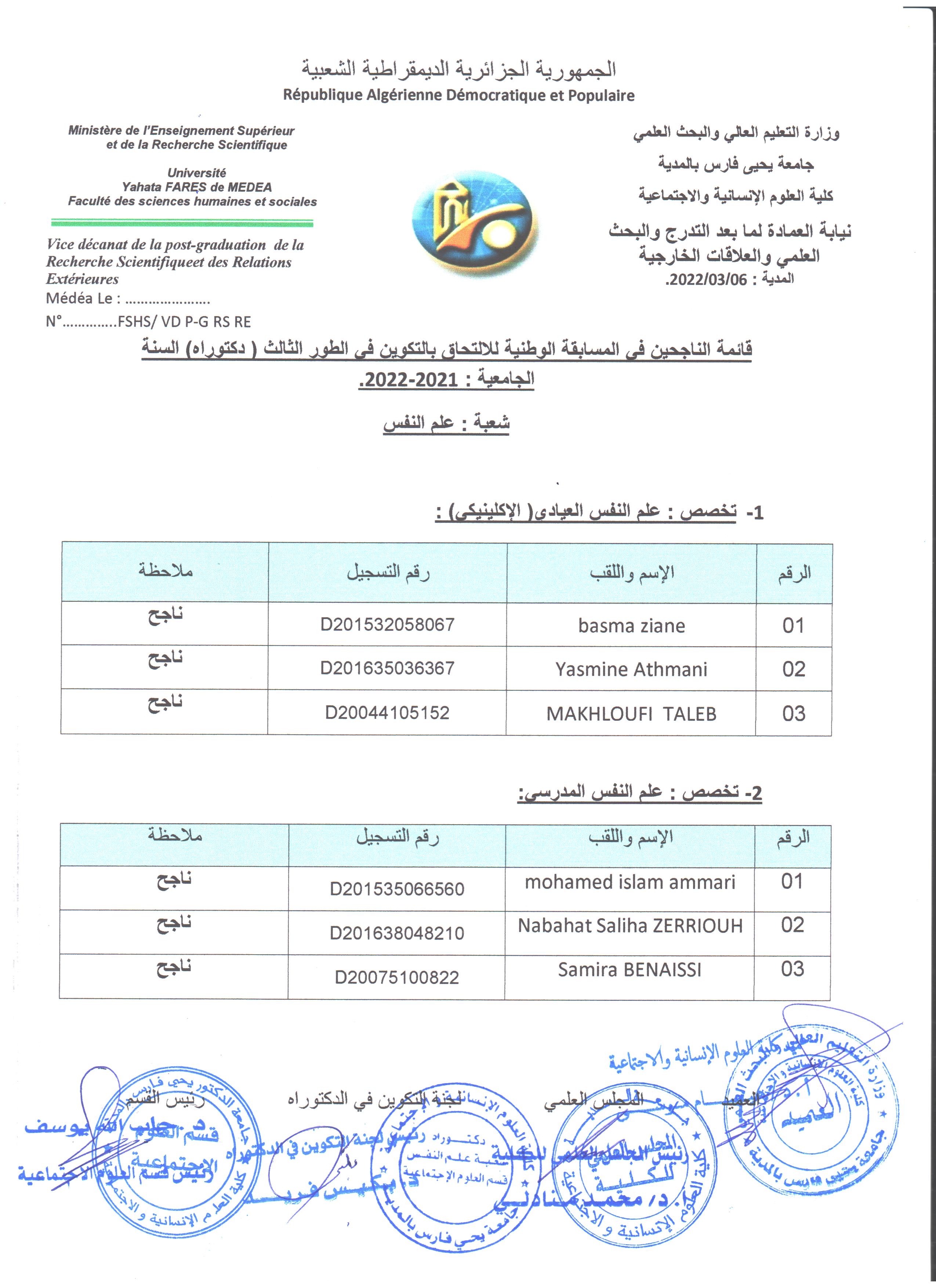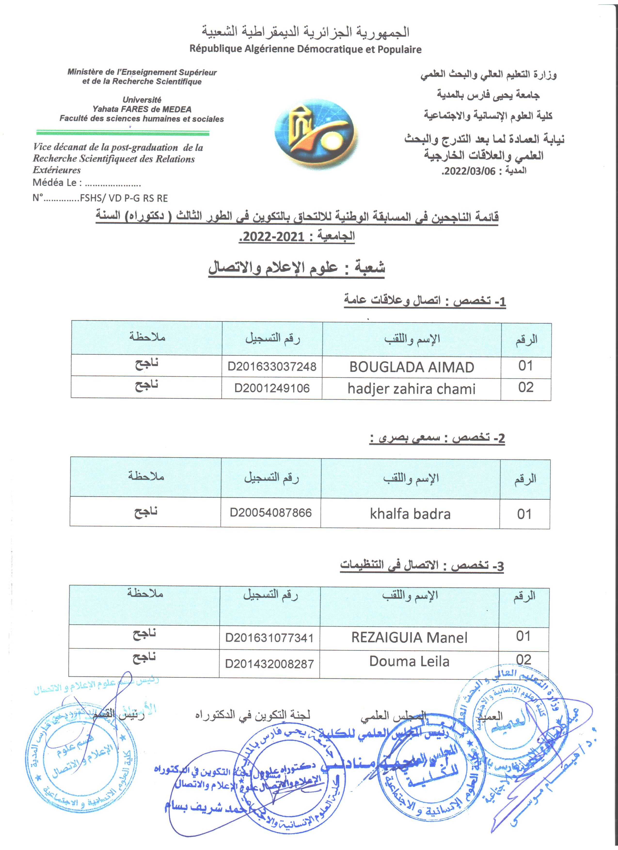 نتائج مسابقة الالتحاق بالطور الثالث دكتوراه